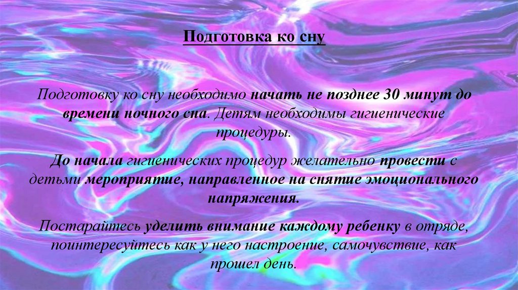 Подготовка ко снуПодготовку ко сну необходимо начать не позднее 30 минут до