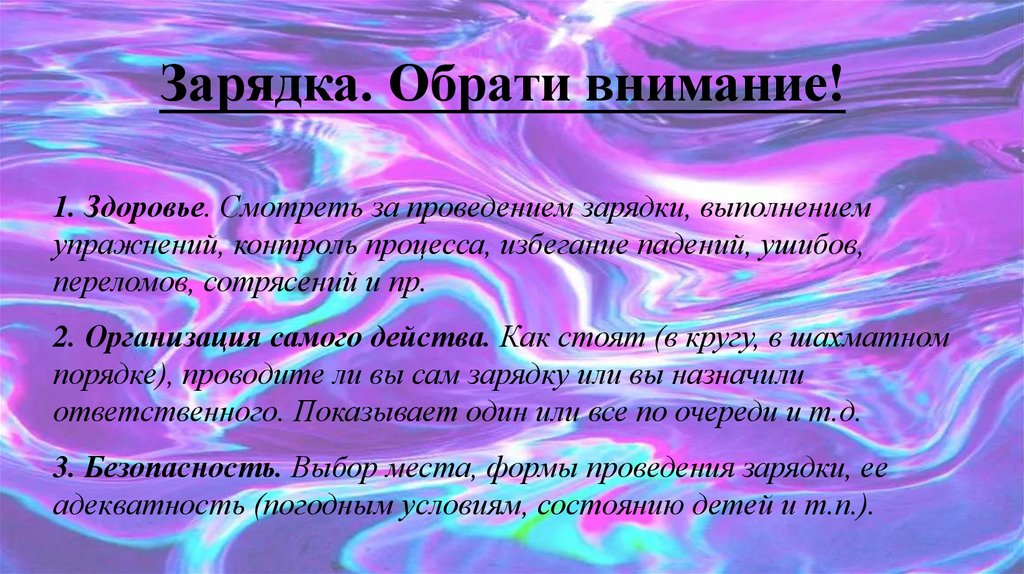 3. Безопасность. Выбор места, формы проведения зарядки, ее