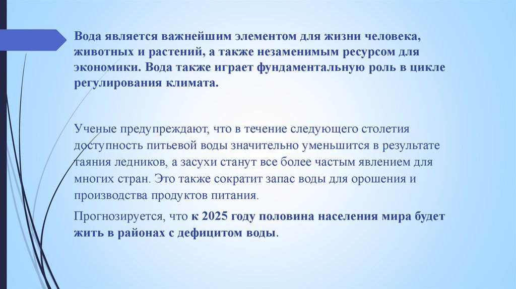 3. Вода является важнейшим элементом для жизни человека, животных и растений, а также незаменимым ресурсом для экономики. Вода