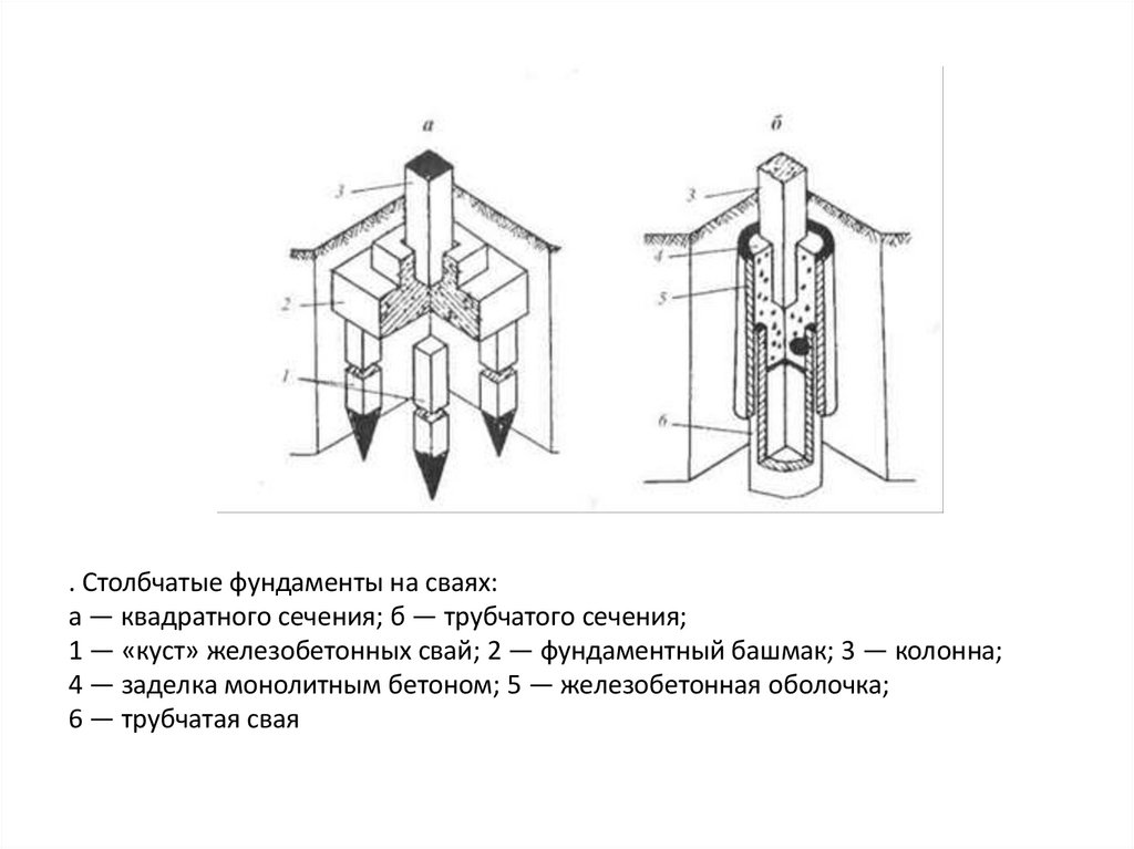 . Столбчатые фундаменты на сваях:а — квадратного сечения; б — трубчатого сечения;