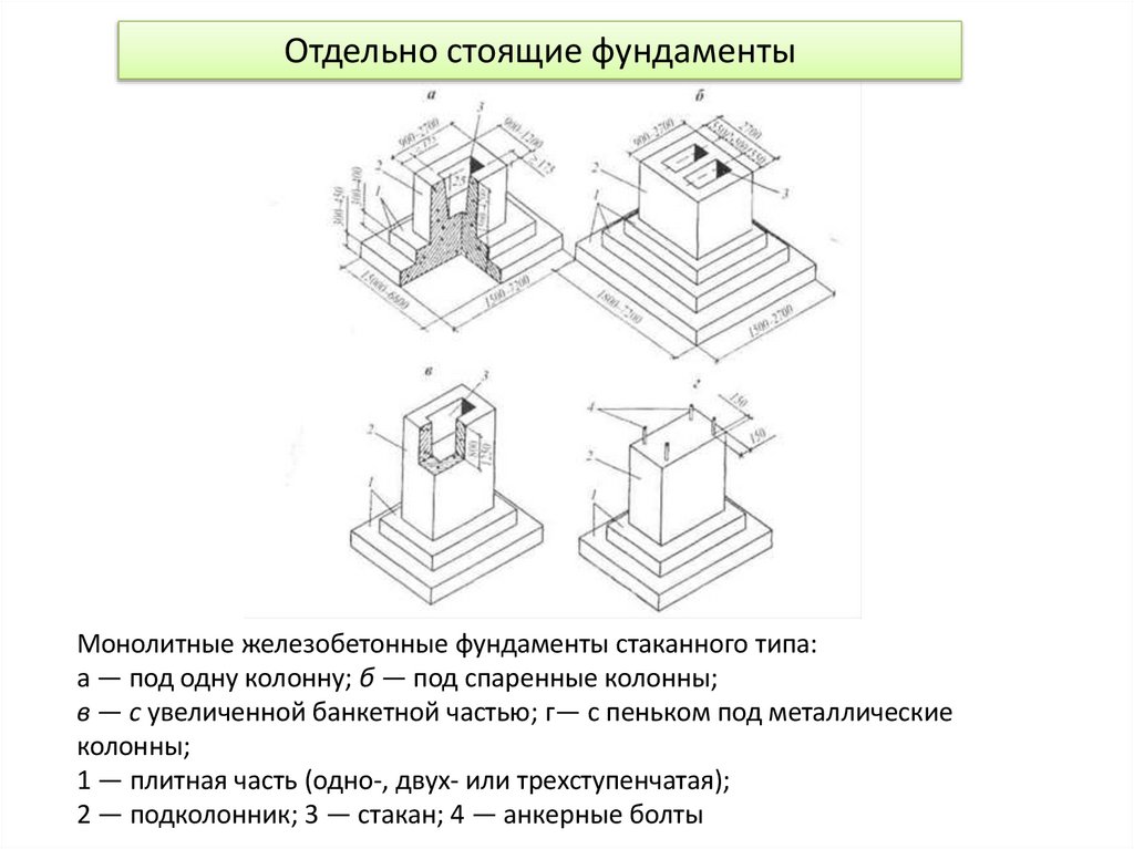 Отдельно стоящие фундаментыМонолитные железобетонные фундаменты стаканного типа: