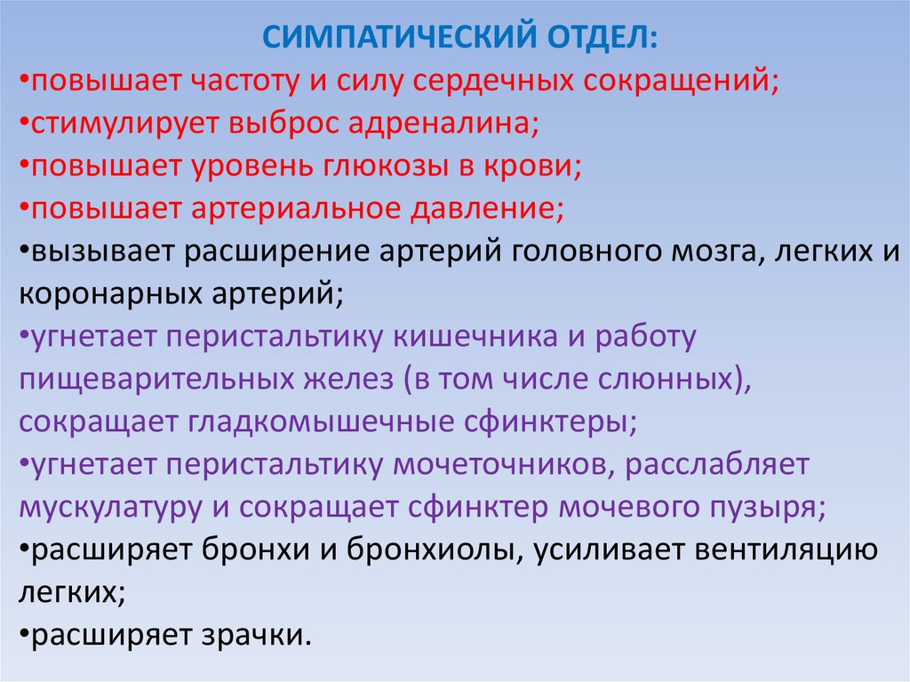 СИМПАТИЧЕСКИЙ ОТДЕЛ:•повышает частоту и силу сердечных сокращений;