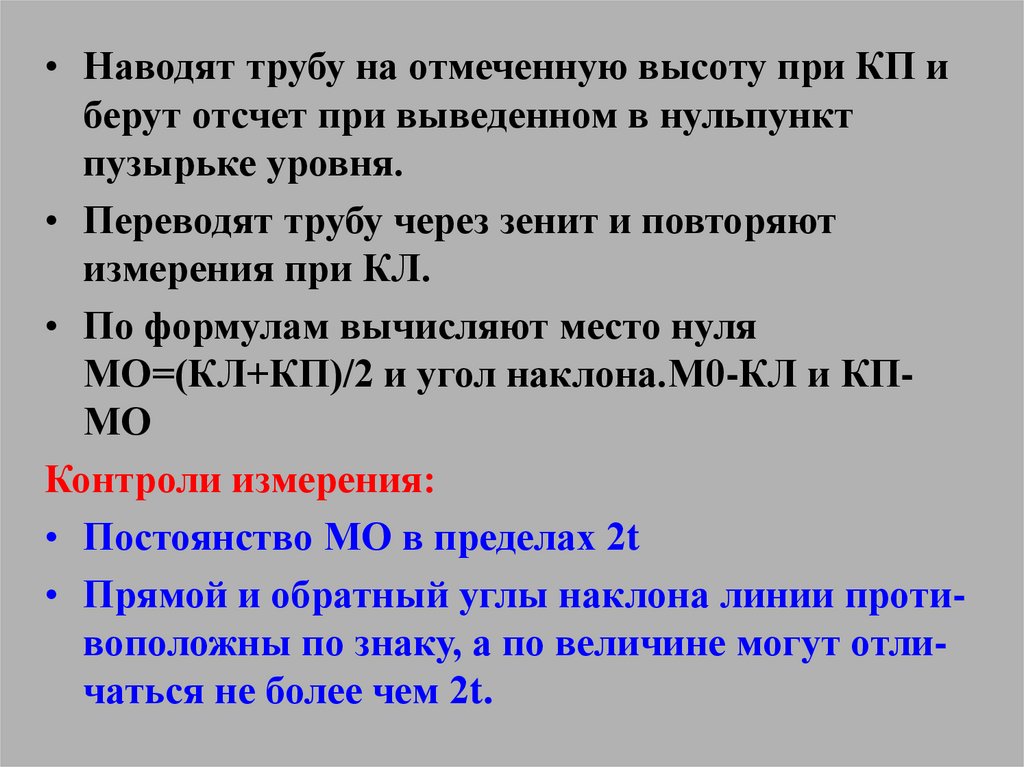 • Наводят трубу на отмеченную высоту при КП иберут отсчет при выведенном в нульпункт