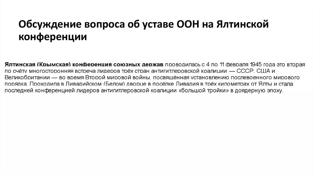 Значение Устава ООН для послевоенного мираУстав ООН, принятый в результате обсуждений на Ялтинской конференции, стал краеугольным