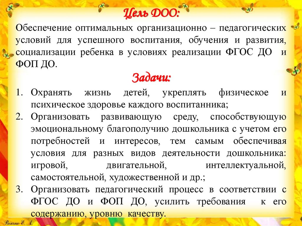 Цель ДОО:Обеспечение оптимальных организационно – педагогических