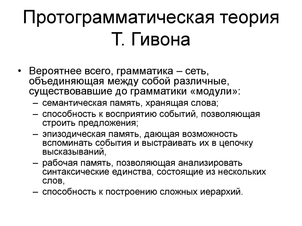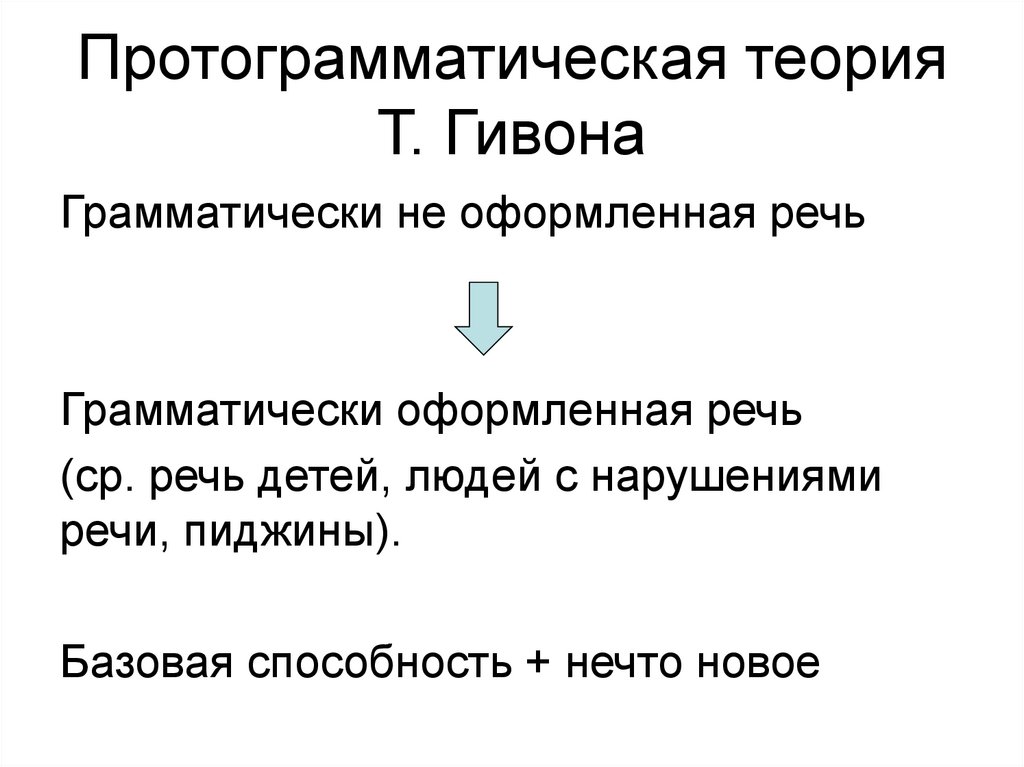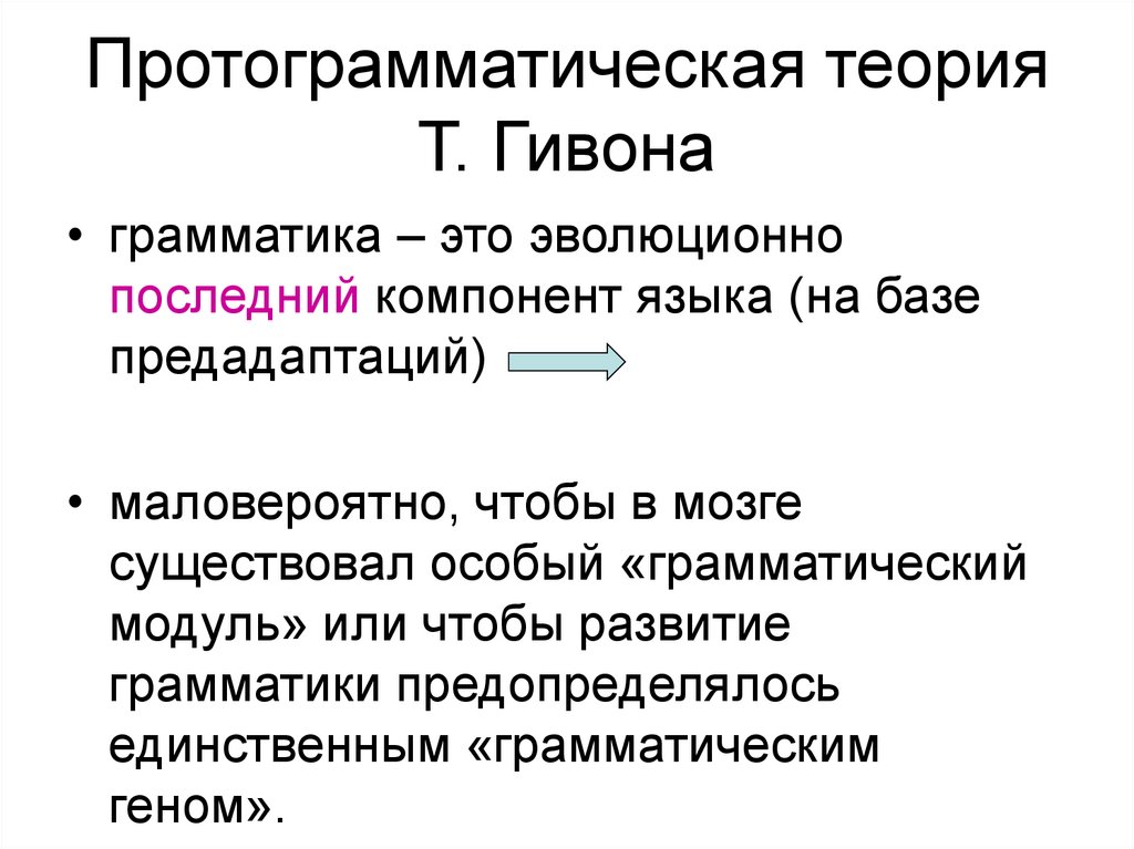 • Одномоментное возникновение языка врезультате генетической мутации,