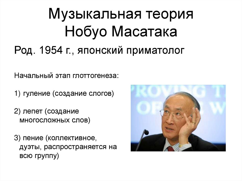 Род. 1954 г., японский приматологНачальный этап глоттогенеза:
