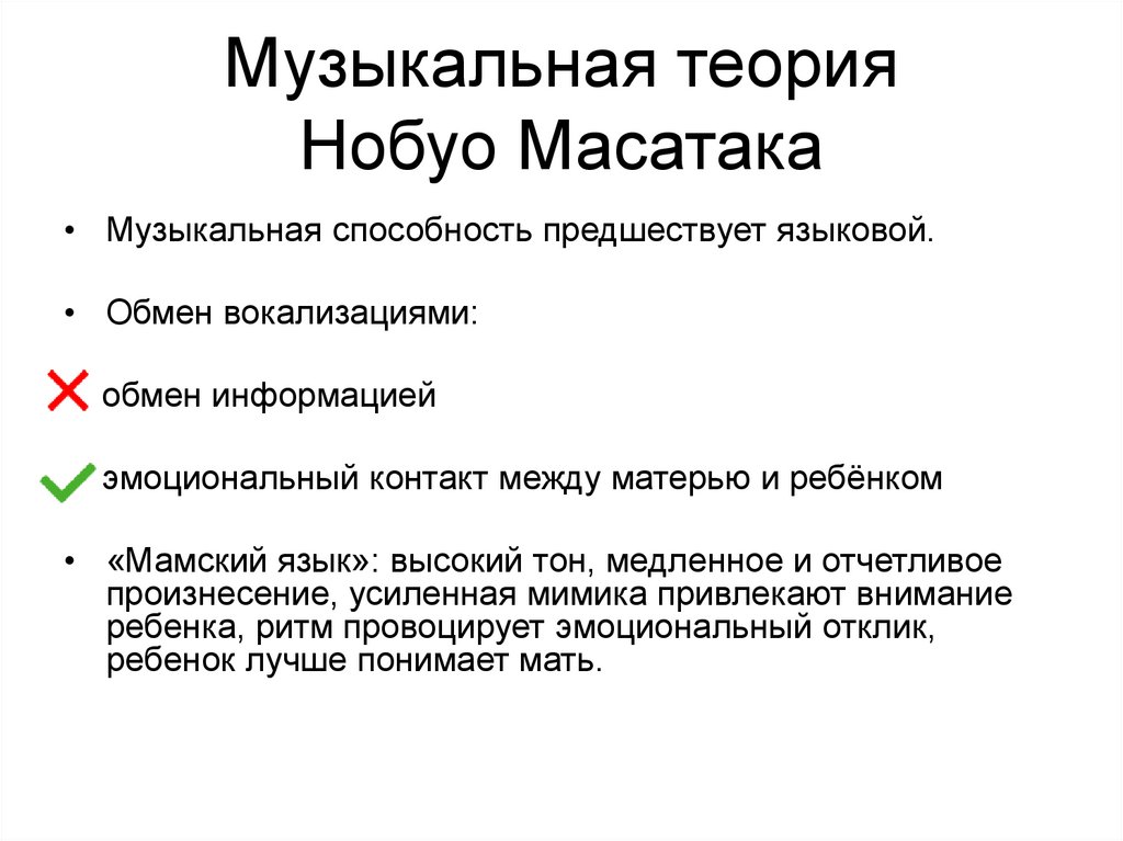 • Музыкальная способность предшествует языковой.• Обмен вокализациями: