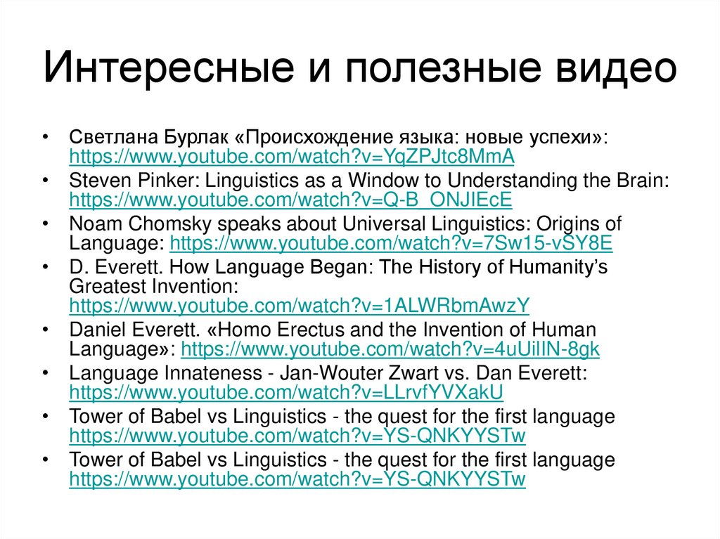 • Светлана Бурлак «Происхождение языка: новые успехи»:https://www.youtube.com/watch?v=YqZPJtc8MmA