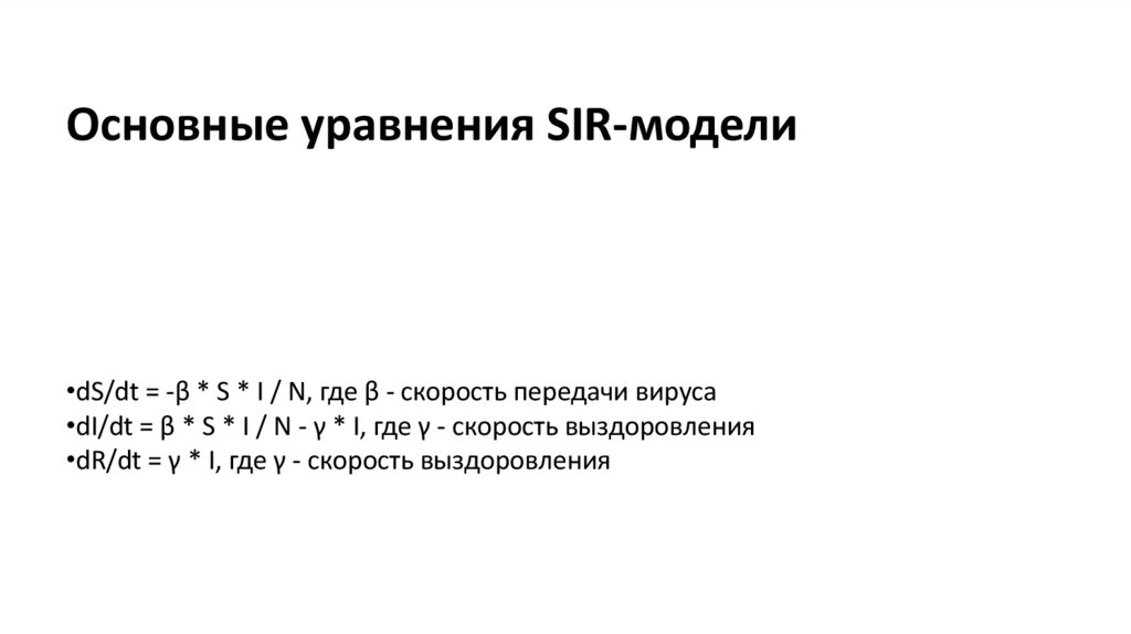 Основные уравнения SIR-модели•dS/dt = -β * S * I / N, где β - скорость передачи вируса