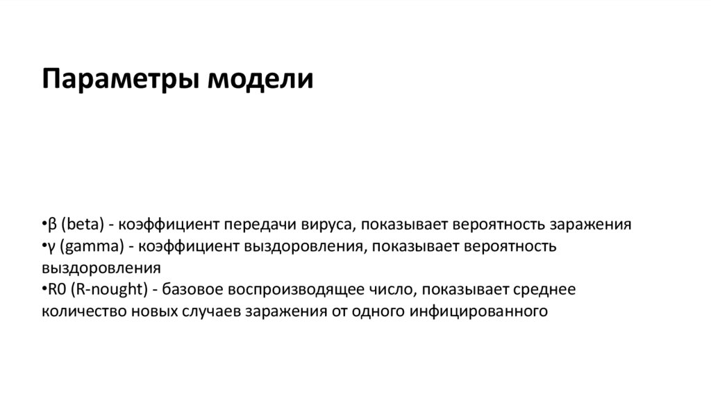Параметры модели•β (beta) - коэффициент передачи вируса, показывает вероятность заражения