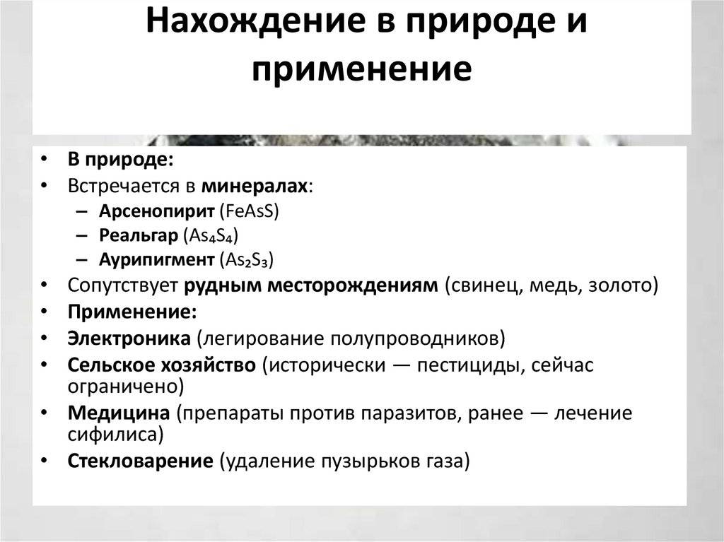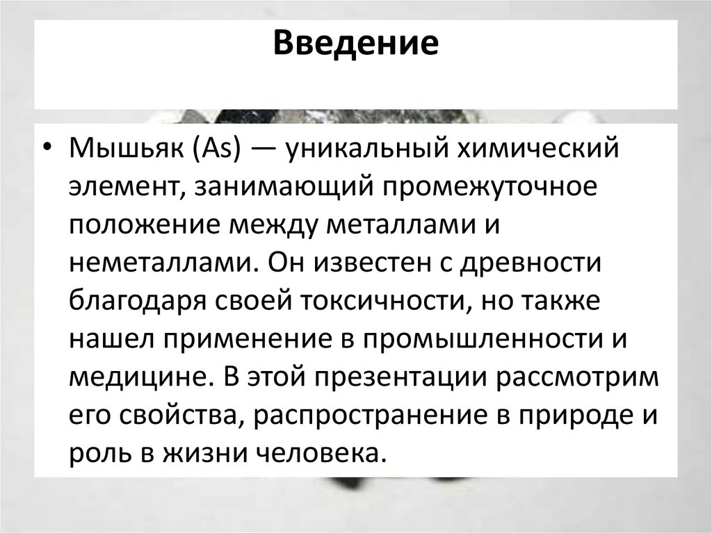 • Мышьяк (As) — уникальный химическийэлемент, занимающий промежуточное