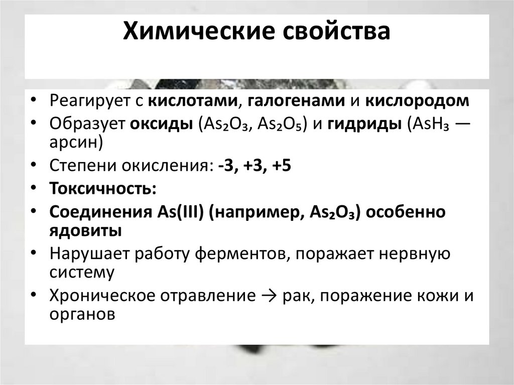• Реагирует с кислотами, галогенами и кислородом• Образует оксиды (As₂O₃, As₂O₅) и гидриды (AsH₃ —