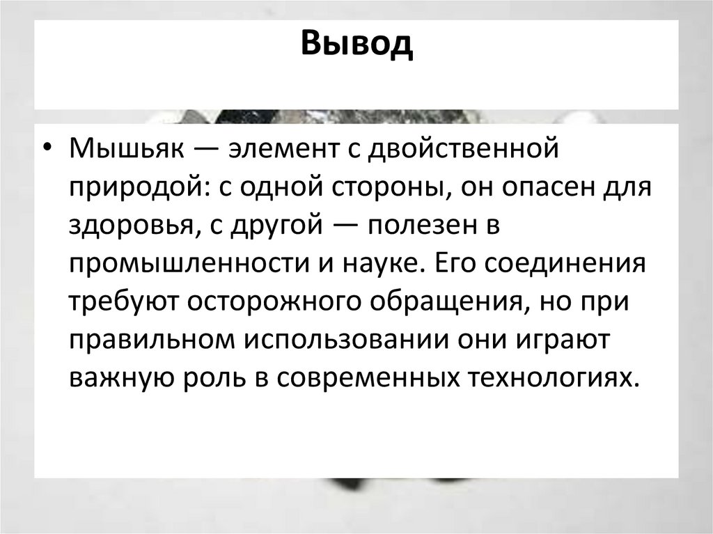 • Мышьяк — элемент с двойственнойприродой: с одной стороны, он опасен для