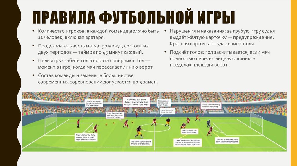 ПРАВИЛА ФУТБОЛЬНОЙ ИГРЫ• Количество игроков: в каждой команде должно быть • Нарушения и наказания: за грубую игру судья