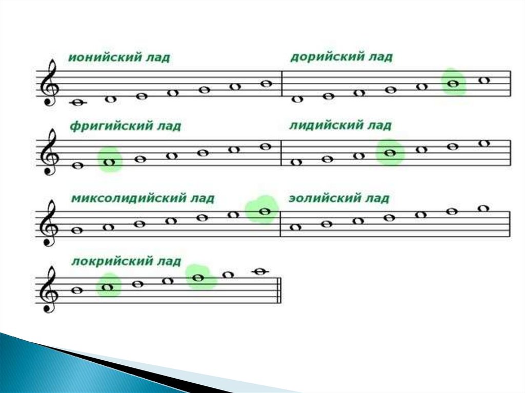Нет знаков альтерации (диатоника)Т: иол., дор., фр., лид., миксол., эол., локр.