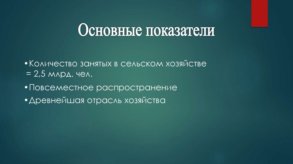 •Количество занятых в сельском хозяйстве= 2,5 млрд. чел.