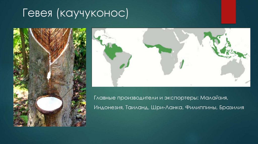 Главные производители и экспортеры: Малайзия,Индонезия, Таиланд, Шри-Ланка, Филиппины, Бразилия