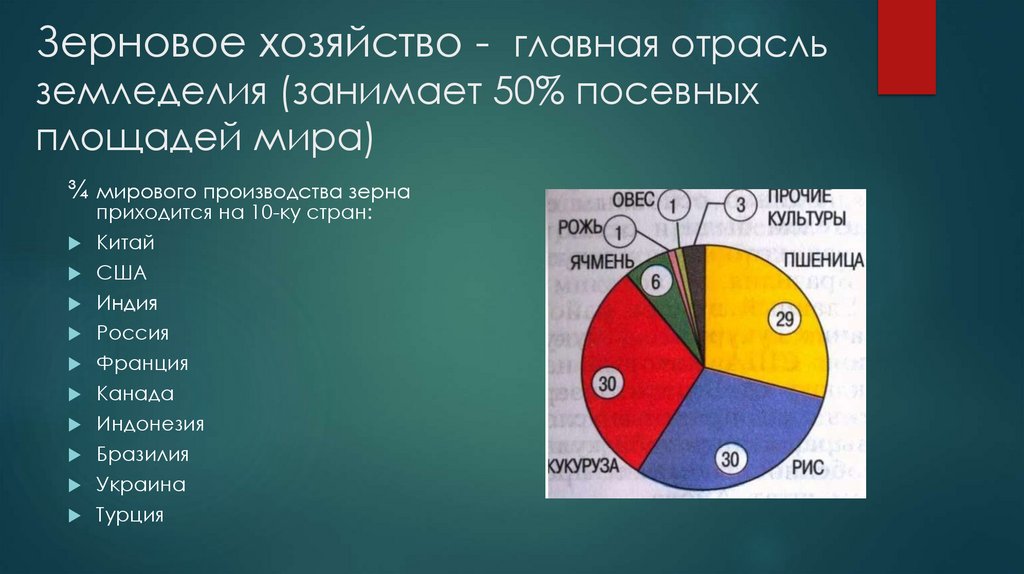 8. Зерновое хозяйство - главная отрасль земледелия (занимает 50% посевных площадей мира)