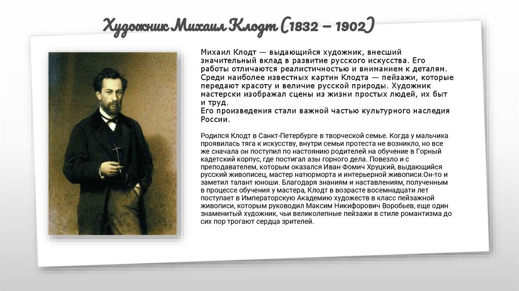 Художник Михаил Клодт (1832 — 1902)Михаил Клодт — выдающийся художник, внесший