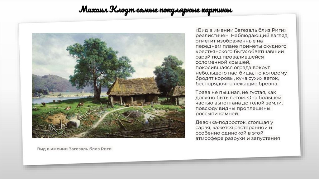 Среди наиболее известных картин Клодта — пейзажи, которые