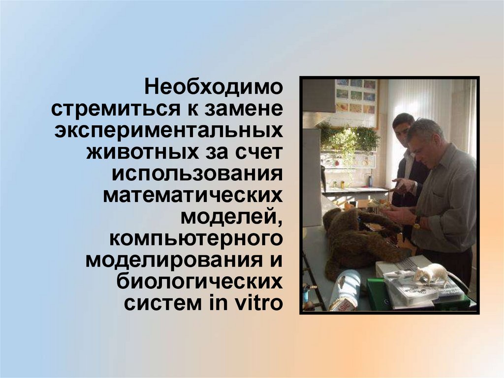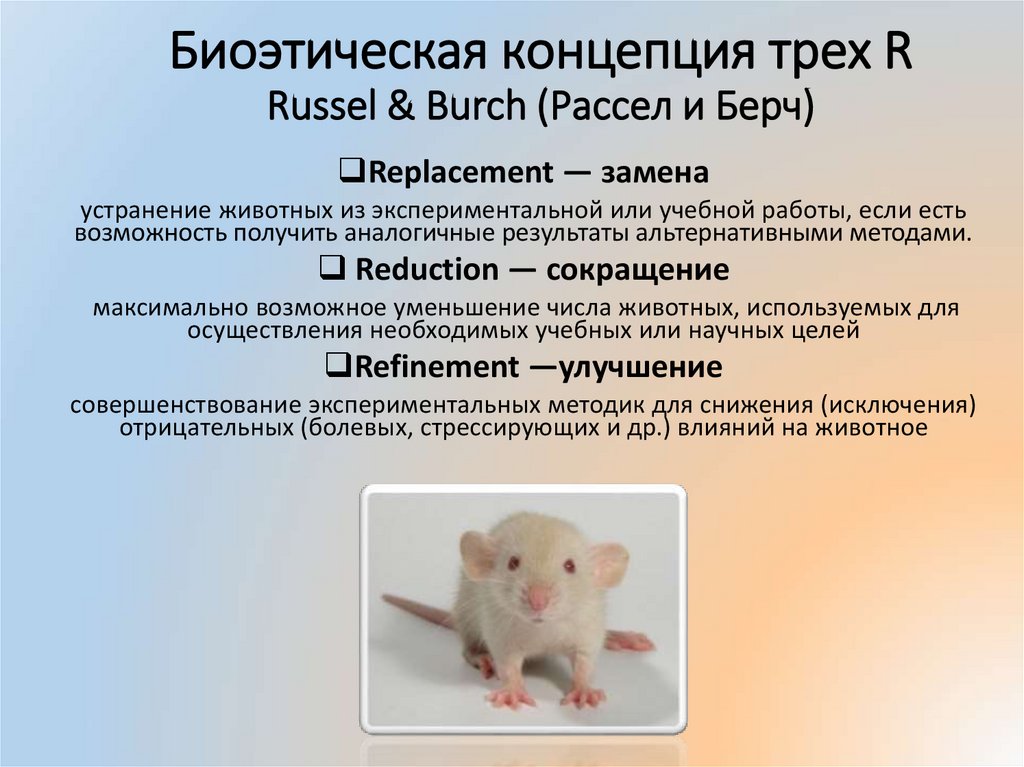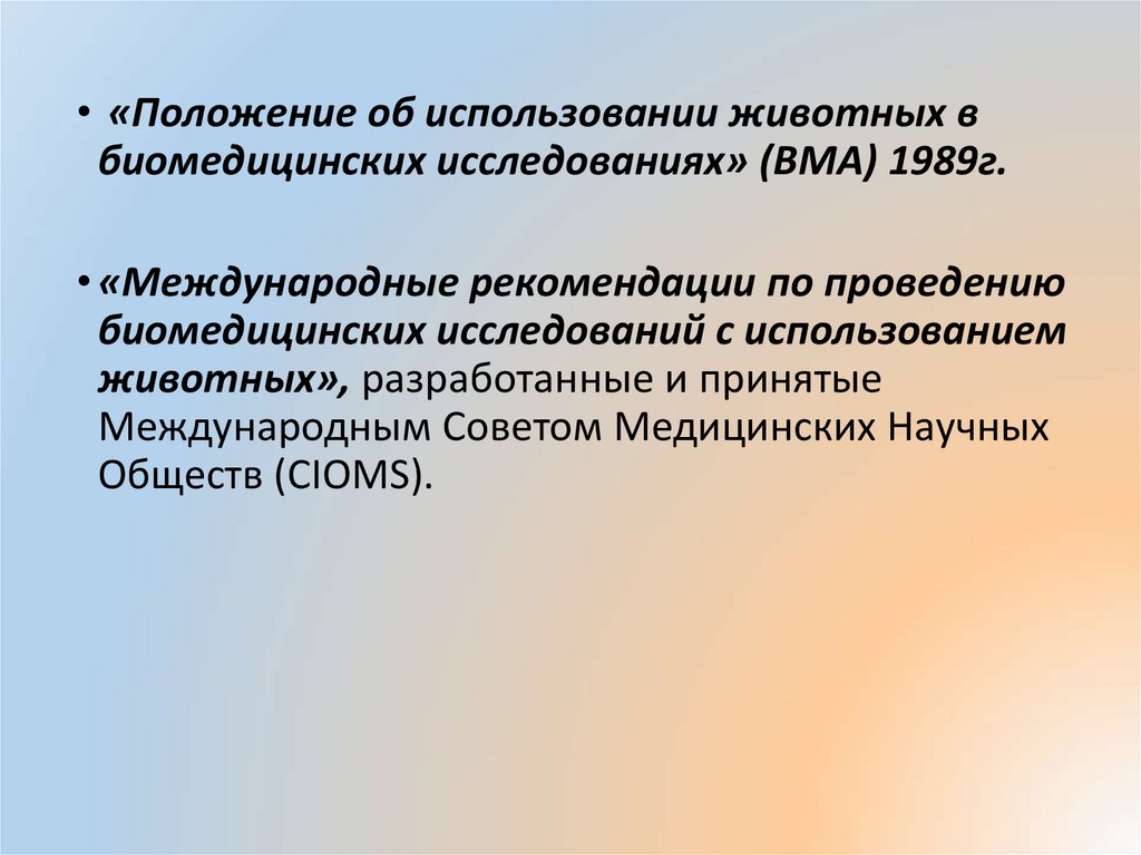 • «Положение об использовании животных вбиомедицинских исследованиях» (ВМА) 1989г.