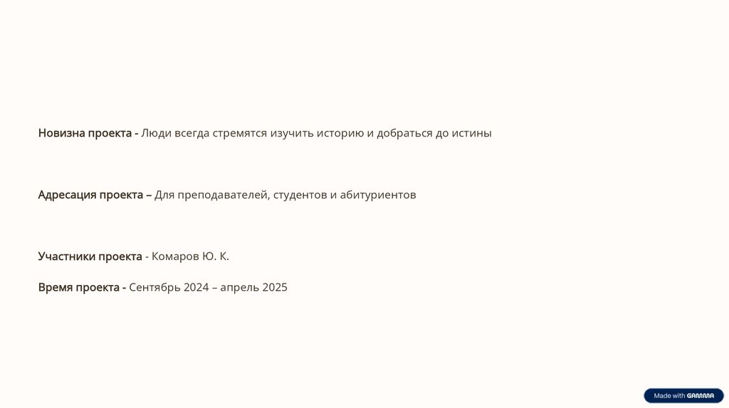 Новизна проекта - Люди всегда стремятся изучить историю и добраться до истиныАдресация проекта – Для преподавателей, студентов и абитуриентов