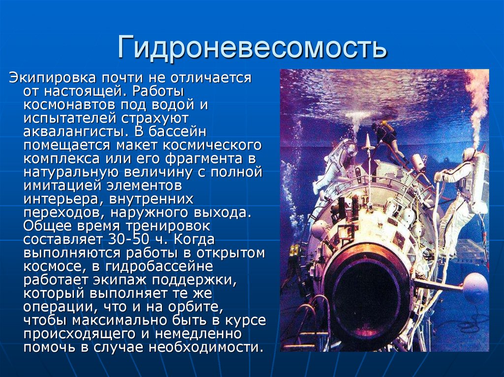 космосе, в гидробассейне