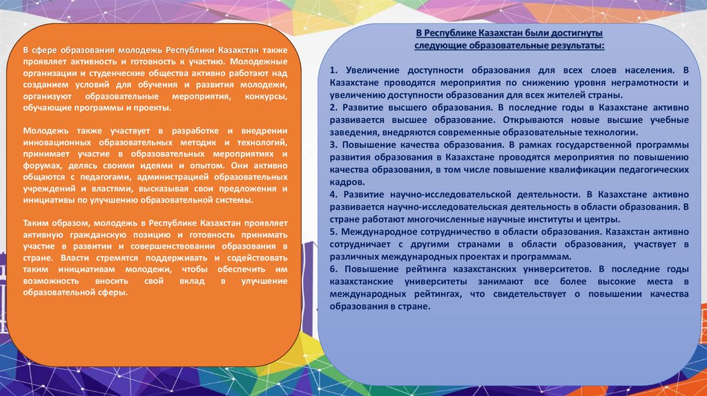 В сфере образования молодежь Республики Казахстан такжепроявляет активность и готовность к участию. Молодежные