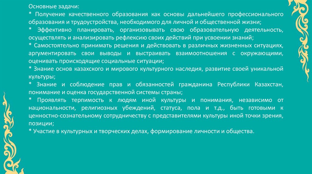 Основные задачи:* Получение качественного образования как основы дальнейшего профессионального