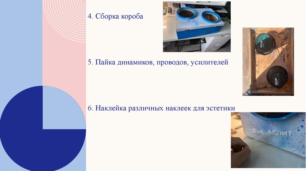 4. Сборка короба5. Пайка динамиков, проводов, усилителей