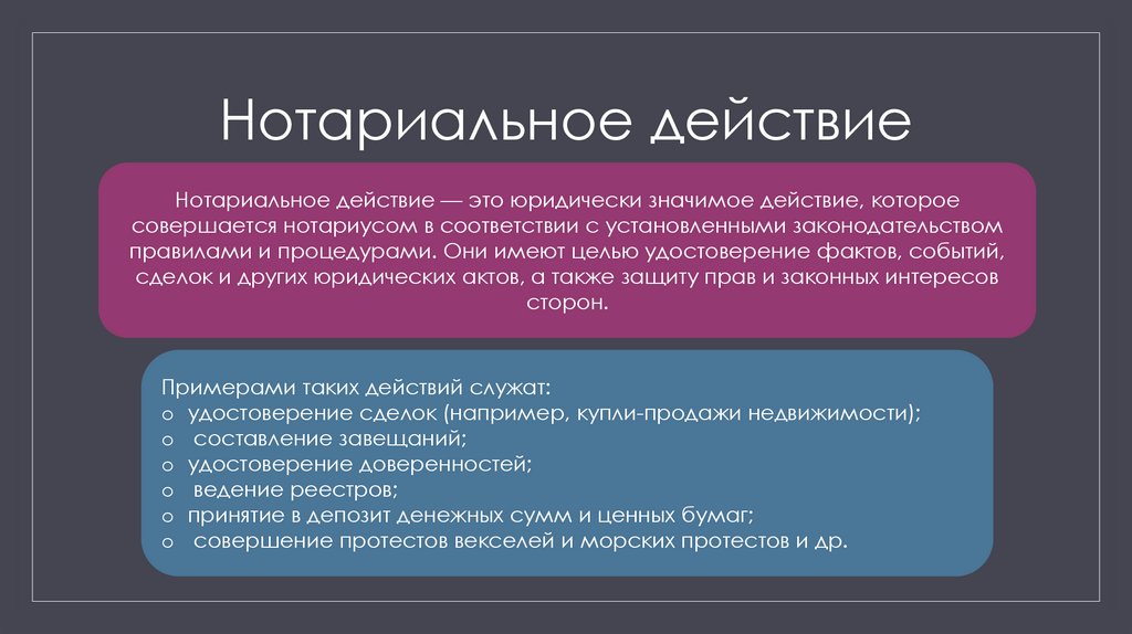 Нотариальное действие — это юридически значимое действие, котороесовершается нотариусом в соответствии с установленными законодательством