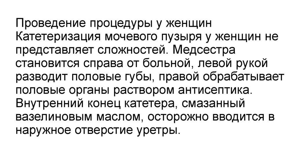 11. Проведение процедуры у женщин Катетеризация мочевого пузыря у женщин не представляет сложностей. Медсестра становится справа от