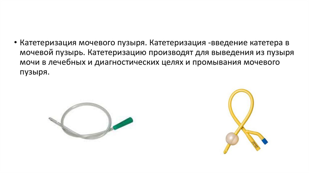 • Катетеризация мочевого пузыря. Катетеризация -введение катетера вмочевой пузырь. Катетеризацию производят для выведения из пузыря