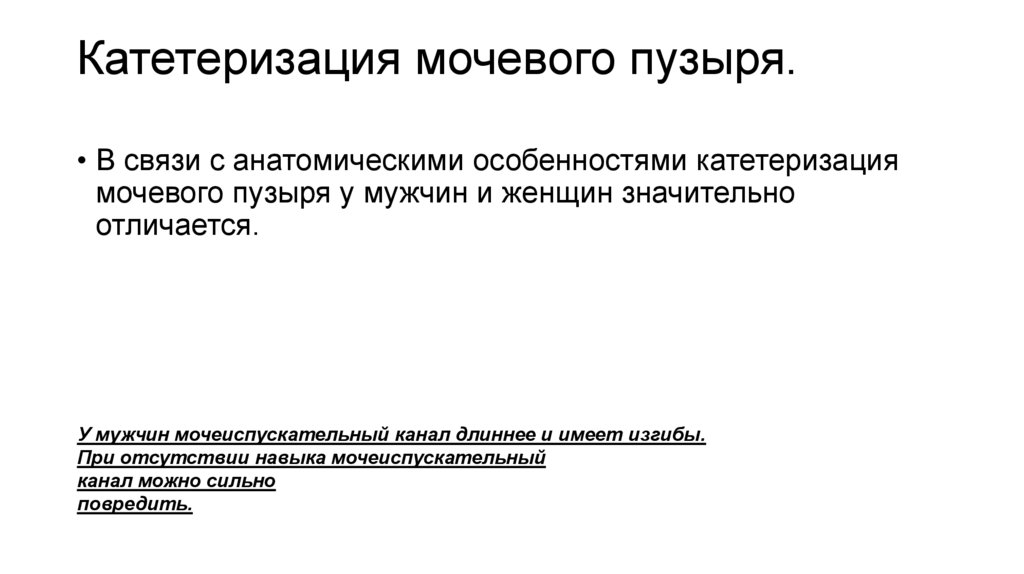 • В связи с анатомическими особенностями катетеризациямочевого пузыря у мужчин и женщин значительно
