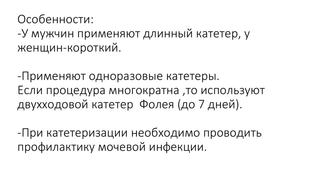 6. Особенности: -У мужчин применяют длинный катетер, у женщин-короткий. -Применяют одноразовые катетеры. Если процедура