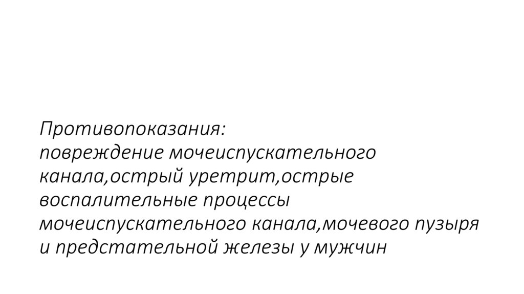 7. Противопоказания: повреждение мочеиспускательного канала,острый уретрит,острые воспалительные процессы мочеиспускательного