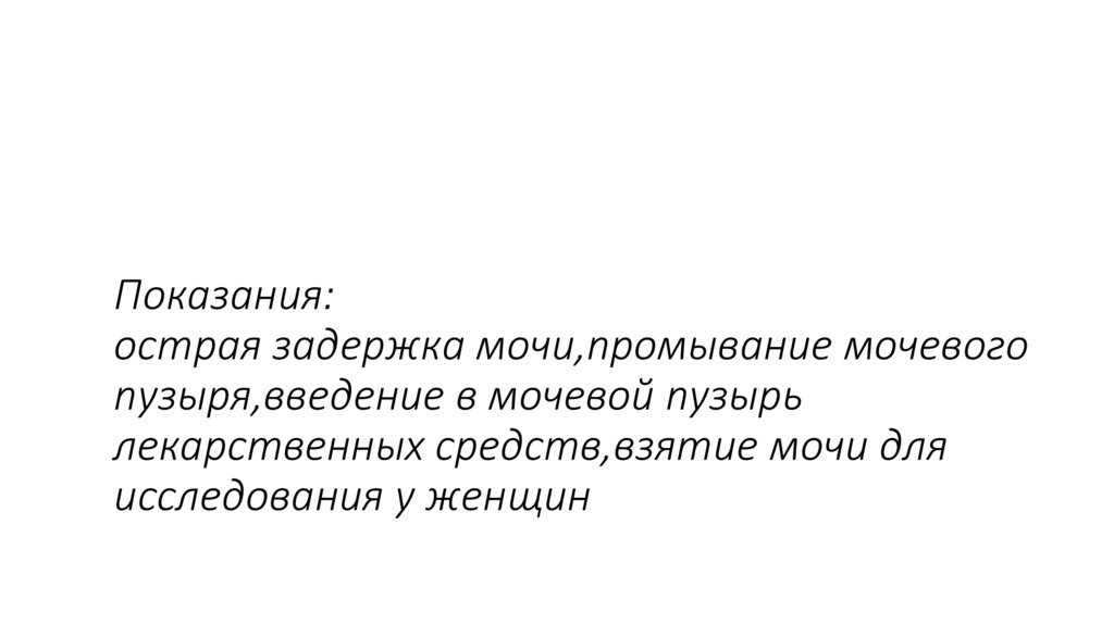 8. Показания: острая задержка мочи,промывание мочевого пузыря,введение в мочевой пузырь лекарственных средств,взятие мочи для