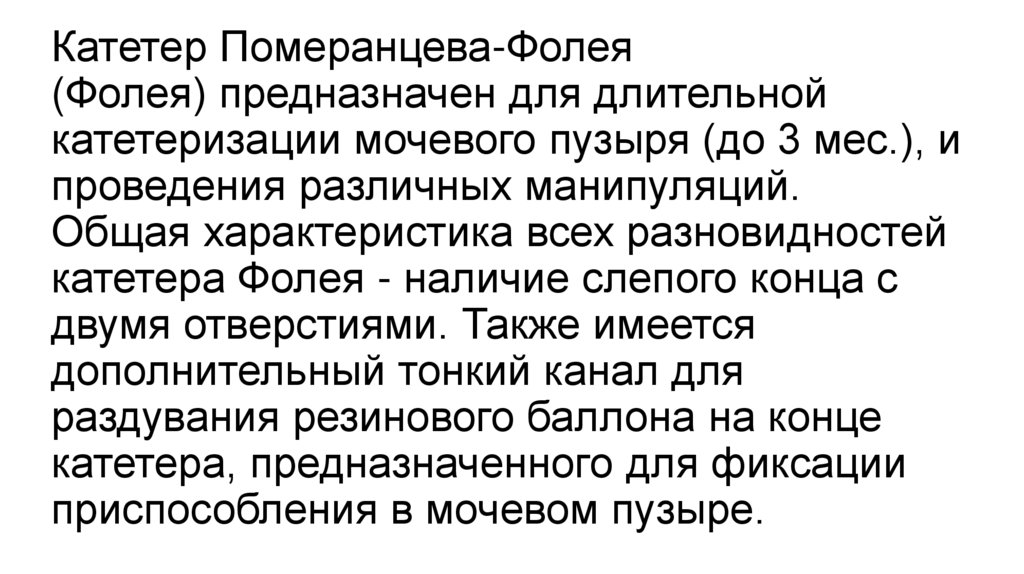 исследования у женщин9. Катетер Померанцева-Фолея (Фолея) предназначен для длительной катетеризации мочевого пузыря (до 3 мес.), и проведения различных