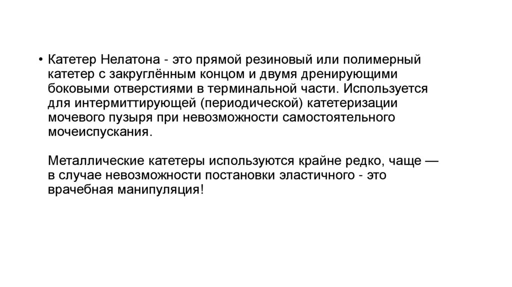 • Катетер Нелатона - это прямой резиновый или полимерныйкатетер с закруглённым концом и двумя дренирующими