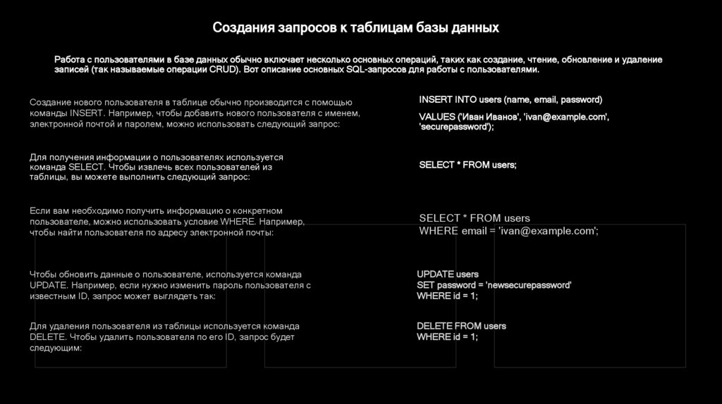Создания запросов к таблицам базы данныхРабота с пользователями в базе данных обычно включает несколько основных операций, таких как создание, чтение, обновление и удаление