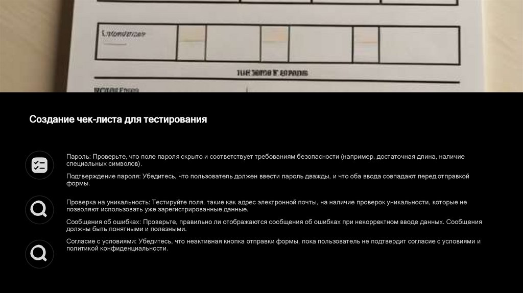 Создание чек-листа для тестированияПароль: Проверьте, что поле пароля скрыто и соответствует требованиям безопасности (например, достаточная длина, наличие