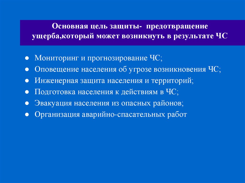 Основная цель защиты- предотвращениеущерба,который может возникнуть в результате ЧС