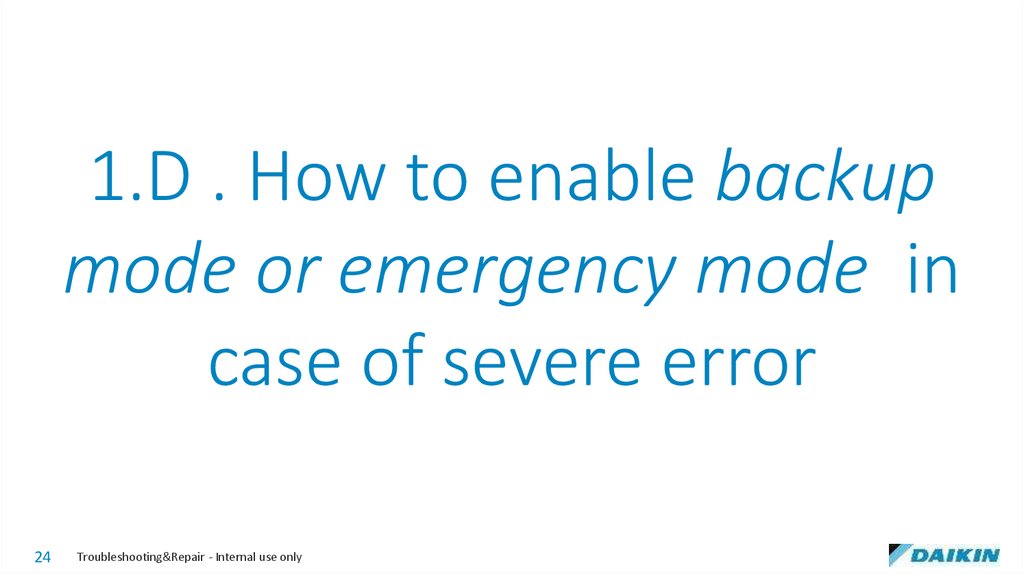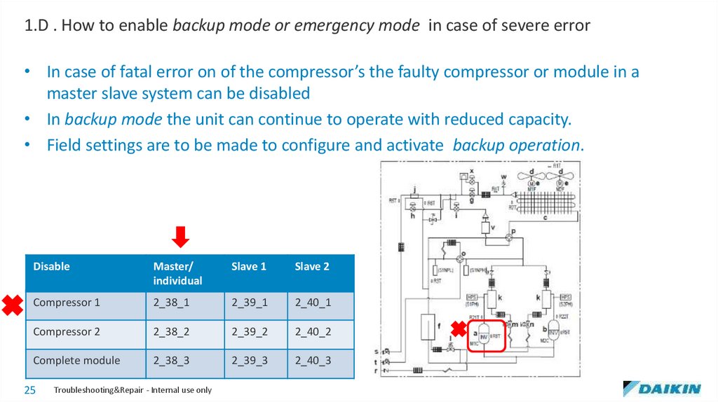 1.D . How to enable backup mode or emergency mode in case of severe error• In case of fatal error on of the compressor’s the faulty compressor or module in a