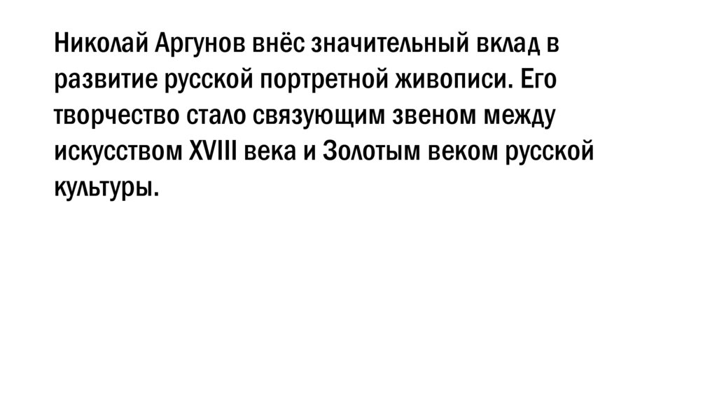 Николай Аргунов внёс значительный вклад вразвитие русской портретной живописи. Его