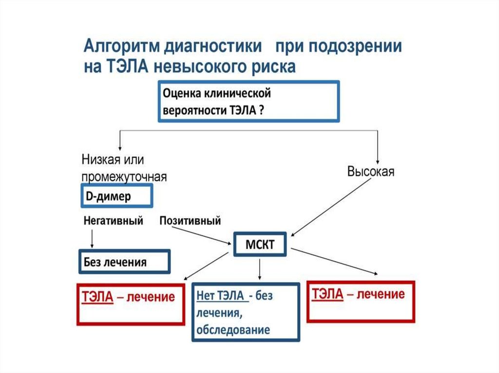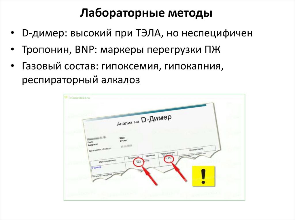 • D-димер: высокий при ТЭЛА, но неспецифичен• Тропонин, BNP: маркеры перегрузки ПЖ