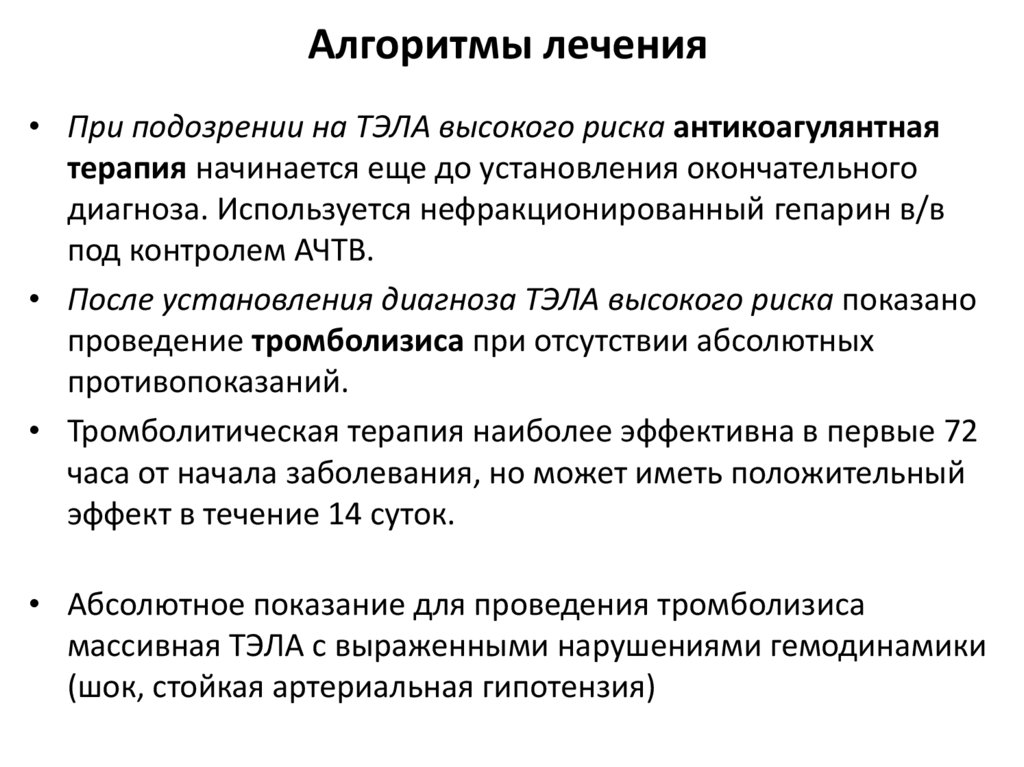 • При подозрении на ТЭЛА высокого риска антикоагулянтнаятерапия начинается еще до установления окончательного