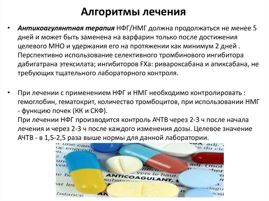 • Антикоагулянтная терапия НФГ/НМГ должна продолжаться не менее 5дней и может быть заменена на варфарин только после достижения