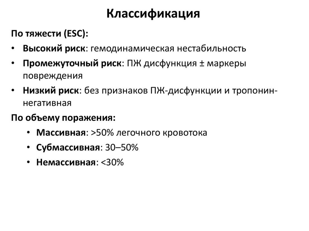 По тяжести (ESC):• Высокий риск: гемодинамическая нестабильность