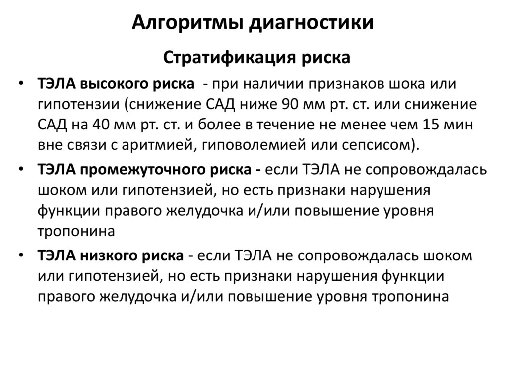 Стратификация риска• ТЭЛА высокого риска - при наличии признаков шока или